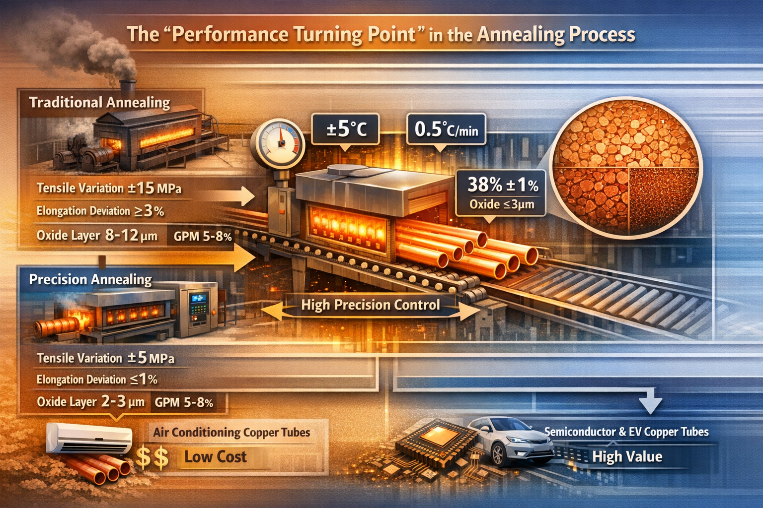“Aynı şeyle bile bakır boru Tavlama işleminde yerli ekipmanlarla işlenen ürünlerin çekme mukavemeti sürekli tutarsız olup, toklukları ithal ekipmanlarla işlenenlere göre %30 daha kötüdür. Yarı iletkenler ve yeni enerji araçlarına yönelik üst düzey siparişleri kabul edemiyoruz.” Jiangsu'daki bir hassas bakır boru şirketinde üretim sorumlusu olan Zhang, atölyedeki iki tavlama fırınına dikkat çekerek sektördeki bir sıkıntı noktasına dikkat çekti. Bakır boru üretiminde temel bir işlem sonrası adım olan tavlama işlemi, tokluk, sertlik ve termal iletkenlik gibi temel performans özelliklerini doğrudan belirler. Basit bir "ısıtma-soğutma" işlemi gibi görünen şey, aslında yüksek kaliteli bakır boruların seri üretiminin anahtarını taşıyor. Şu vea, Çin'deki çoğu küçük ve orta ölçekli bakır boru üreticisi hala geleneksel tavlama ekipmanına ve ampirik işlemlere güveniyor ve bu da yetersiz ürün performansı istikrarına neden oluyor; Ancak birkaç üst düzey üretici, ithal hassas tavlama ekipmanı ve dijital sıcaklık kontrol teknolojisini kullanarak üst düzey sipariş pazarını sağlam bir şekilde güvence altına aldı. Tavlama işlemindeki ince farklılıklar nedeniyle aynı bakır boru hammaddeleri, çok farklı ürün rekabet gücüne yol açar. Bu " detay süreci Çoğu şirketin göz ardı ettiği "" ifadesi, Çin bakır boru endüstrisinin üst düzey pazara doğru ilerlemesini engelleyen görünmez bir engel haline geliyor.