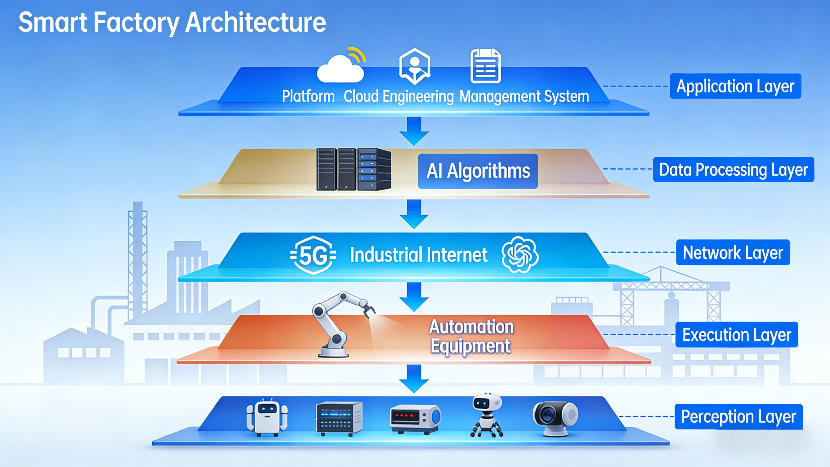 Şekil: Akıllı fabrika mimarisi tipik olarak algı, ağ, veri işleme, yürütme ve uygulama katmanlarını içerir ve sensörlerden bulut platformlarına veri akışını sağlar.
