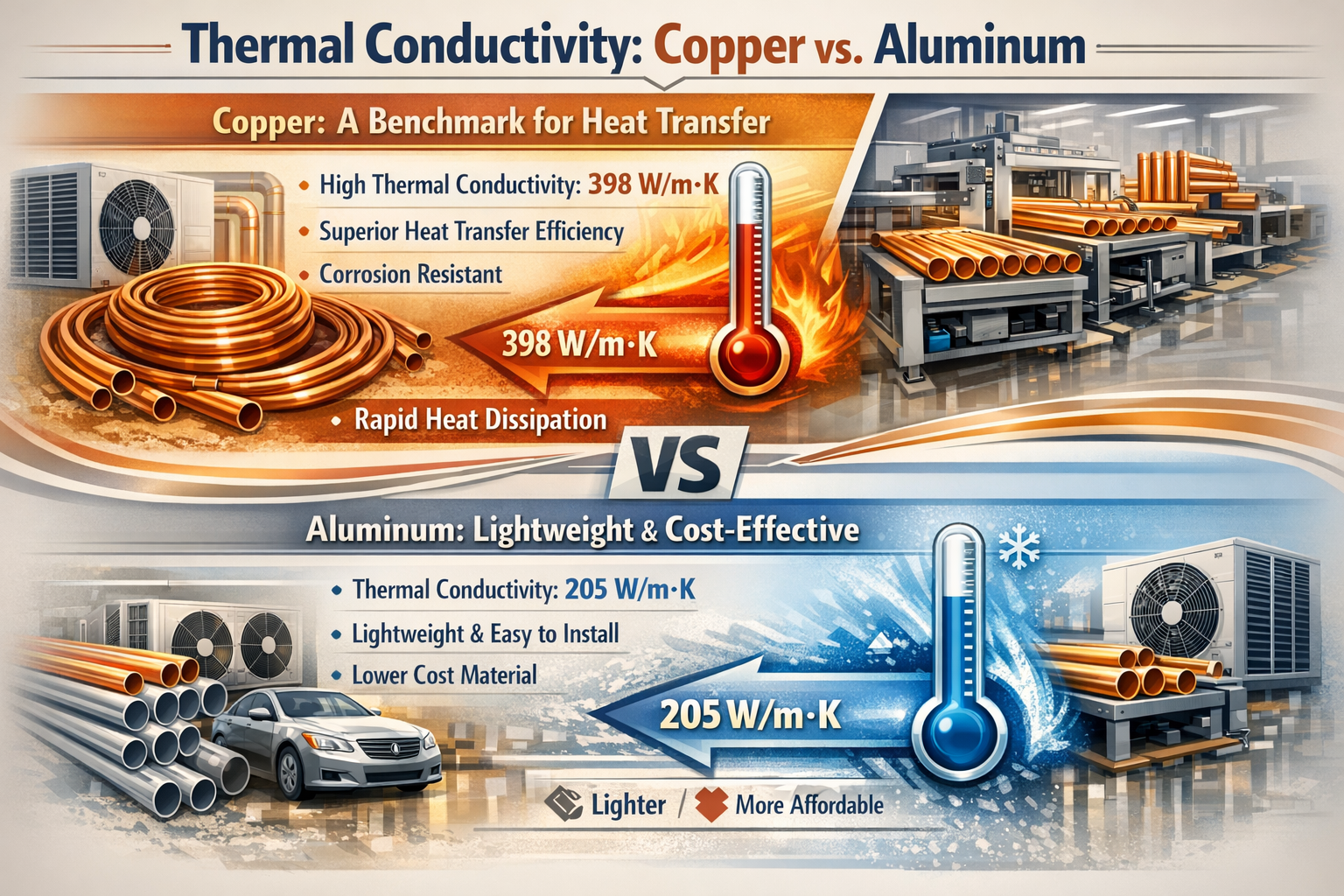 Bu tablo, aralarındaki belirgin farkları vurgulamaktadır. bakır ve alüminyum tüpler, ile bakır üstün teklif ısı transferi ancak daha yüksek bir maliyetle alüminyum daha hafiftir ve uygun maliyetli ancak performans ve dayanıklılıkta ödünleşimler de beraberinde gelir.