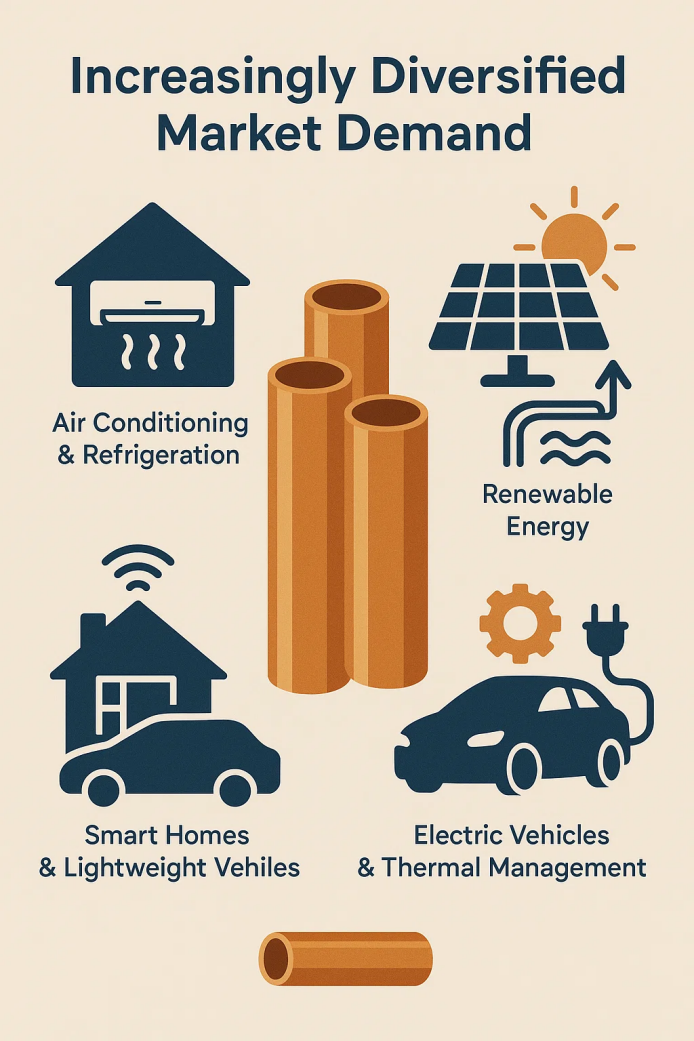 Akıllı evlerin, hafif araçların ve elektrifikasyonun hızlandırılmış gelişimi ile bakır tüplerin uygulama senaryoları da genişliyor. Yüksek performanslı bakır tüpler, sadece ev aletlerindeki kondansatörler ve evaporatörler için çekirdek bileşenler değil, aynı zamanda yeni enerji araçlarının termal yönetim sistemlerinde de önemli bir rol oynar. Bu pazarın büyümeye devam etmesi bekleniyor.