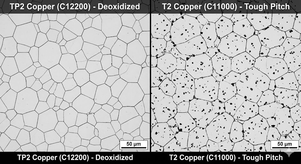 C: T2 bakır, kaynak sırasında "hidrojen kırılganlığına" neden olan ve çatlaklara yol açan eser miktarda oksijen içerir. TP2'nin oksiti giderilmiştir; bu, yapısal bütünlüğünü kaybetmeden tekrar tekrar sert lehimlenip kaynak yapılabileceği anlamına gelir.