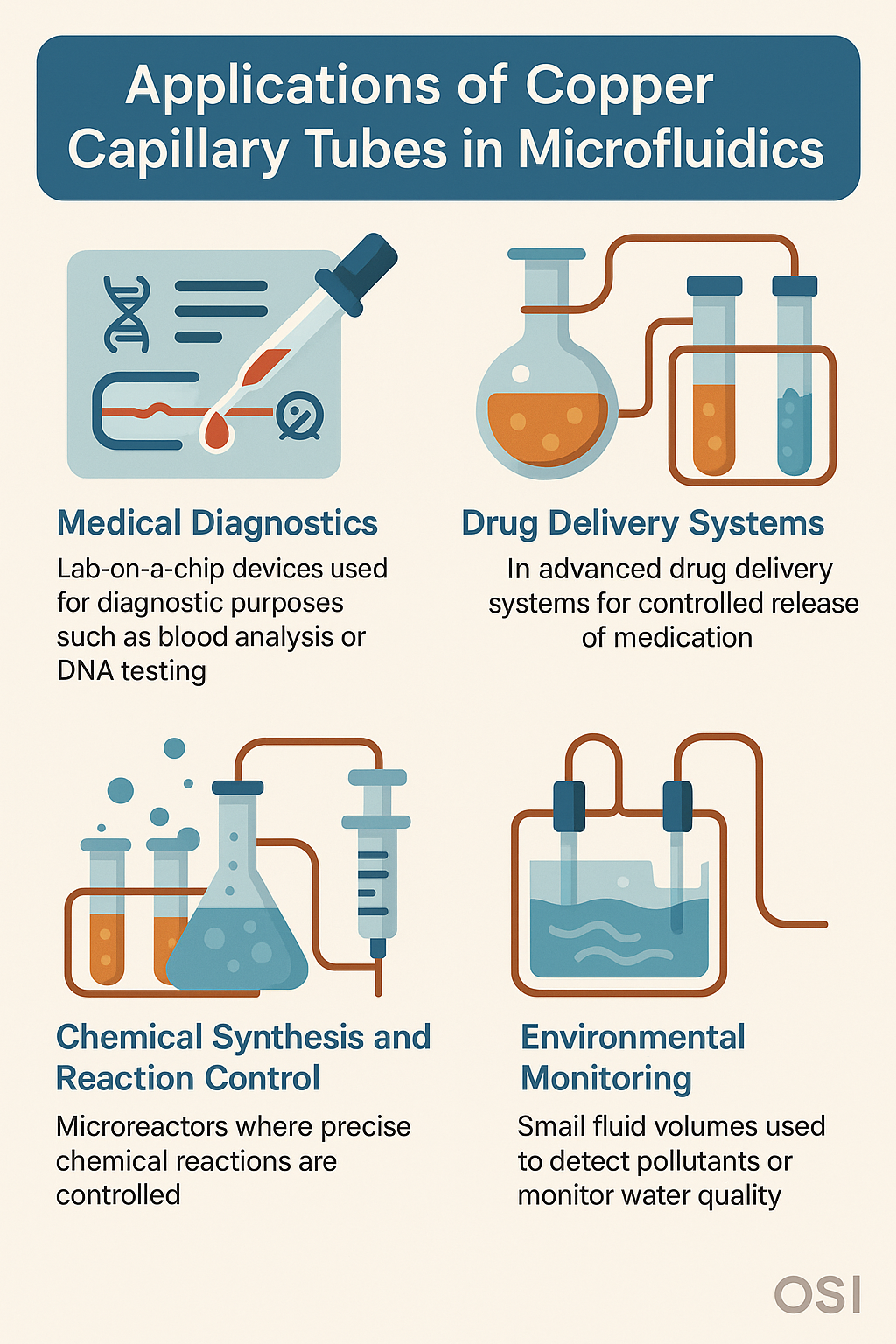 Çok yönlülüğü bakır kılcal borular çeşitli mikroakışkan uygulamalarda kullanılmalarına olanak tanır. Bu tüplerin kullanıldığı en öne çıkan alanlardan bazıları şunlardır: