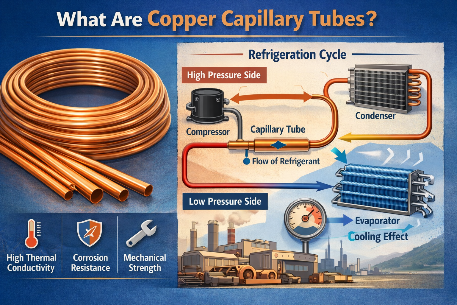 Soğutma sistemleri, gıda ve ilaçların kveyaunmolarakından evlerimizin ve işyerlerimizin konforunu korumaya kadar günümüz yaşamının vazgeçilmezidir. Bu sistemlerin verimli çalışmasını sağlayan temel bileşenlerden biri de kılcal boru . Kılcal borular için kullanılan çeşitli malzemeler arasında, bakır benzersiz özellikleri nedeniyle ideal bir seçim olduğu kanıtlanmıştır.